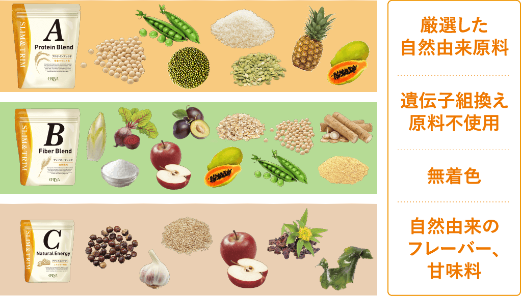 大豆、エンドウ豆、米、オート麦といった穀物から、にんにく、しょうが、黒コショウなどのハーブやスパイス、そしてパパイヤ、パイナップル、プルーンなど、スリム&トリム A・B・Cは、厳選された自然由来原料を使用し、遺伝子組換え原料不使用、無着色、天然のフレーバーと甘味料で仕上げています。どなたにも安心して、毎日続けてお召しあがりいただけます。