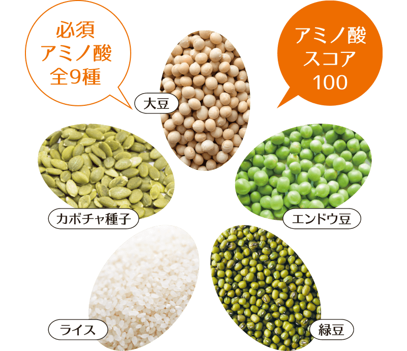 人間の体の構成成分として、水に続いて多いのが「たんぱく質」。私たちの体にとって「最も基本的で重要な栄養素」とも言えます。ですから、高品質が求められることは言うまでもありません。A プロテインブレンドのたんぱく質は、大豆やエンドウ豆など5種類の厳選した植物性たんぱく質を配合。しかも体内で作り出すことができない必須アミノ酸9種類を含み、たんぱく質の評価基準であるアミノ酸スコアも最高値の100。現代食をしっかりと底上げしていきます。